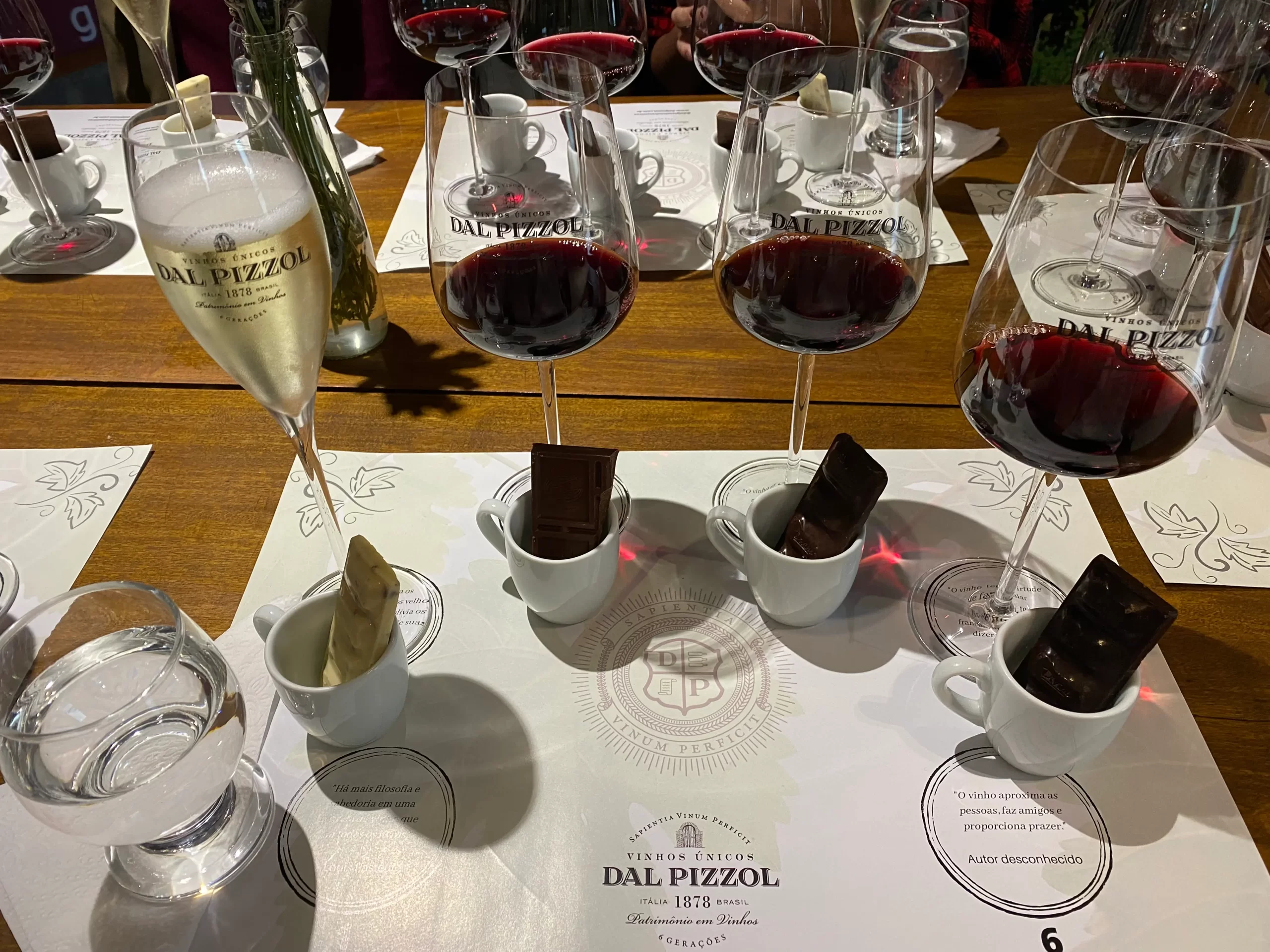 O quarto dia começou dedicado à Dal Pizzol, uma vinícola que é quase um parque temático do vinho no melhor sentido: árvores, lagos, o famoso “vinhedo do mundo” com castas de vários países. É um passeio que agrada perfis diferentes, quem quer aprender, quem quer fotografar, quem quer só caminhar entre as histórias. Foi lá que mergulhamos em uma experiência sensorial de harmonização de vinhos com chocolate. A combinação que ganhou o meu coração foi a de espumante com chocolate branco: a doçura e a textura do chocolate abraçam a acidez e as bolhas com um equilíbrio espetacular, para variar o mundo dos vinhos sempre me surpreende. Além dessa, exploramos vinhos tintos harmonizados com diferentes tipos de chocolate, mostrando a versatilidade e a riqueza dessa combinação.
